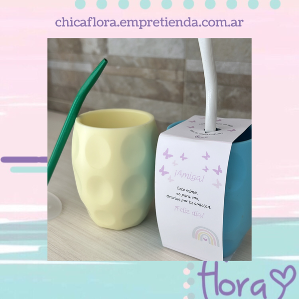 🌸 Mates de colores con bombilla y saca yerba con packaging amistad